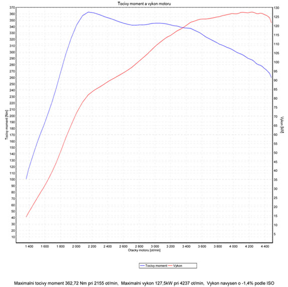 Měření vozidla na originální software spolu s diagnostikou jasně ukazují, že je vozidlo v odpovídajícím stavu: naměřený výkon na originální software je 127kW/362NM (výrobcem udaná hodnota je 125kW/350NM)