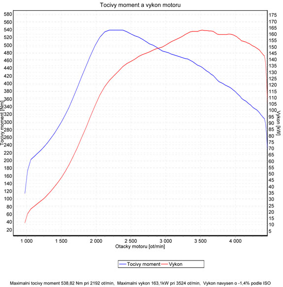 Měření vozidla na originální software spolu s diagnostikou jasně ukazují, že je vozidlo v odpovídajícím stavu: naměřený výkon na originální software je 163kW/538NM (výrobcem udaná hodnota je 160kW/500NM)