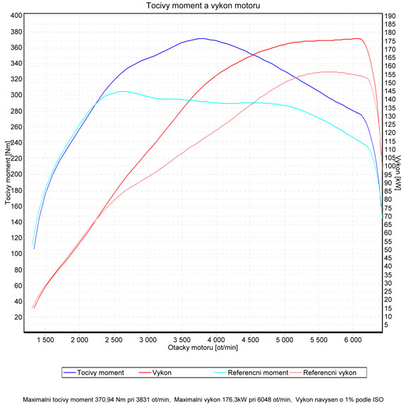 Je jasně patrné že po úpravě došlo k fyzickému nárustu výkonu o 20kW a 65nm, stojí ovšem za povšimnutí že ve středních otáčkách výkon stoupl až o 30kW! Tento vůz není jednoduché upravit správně, proto velmi zvažujte komu své auto svěříte, můžete se místo slíbeného zvýšení výkonu dočkat pouze cukání v zátěži a znatelně zvýšené spotřeby.